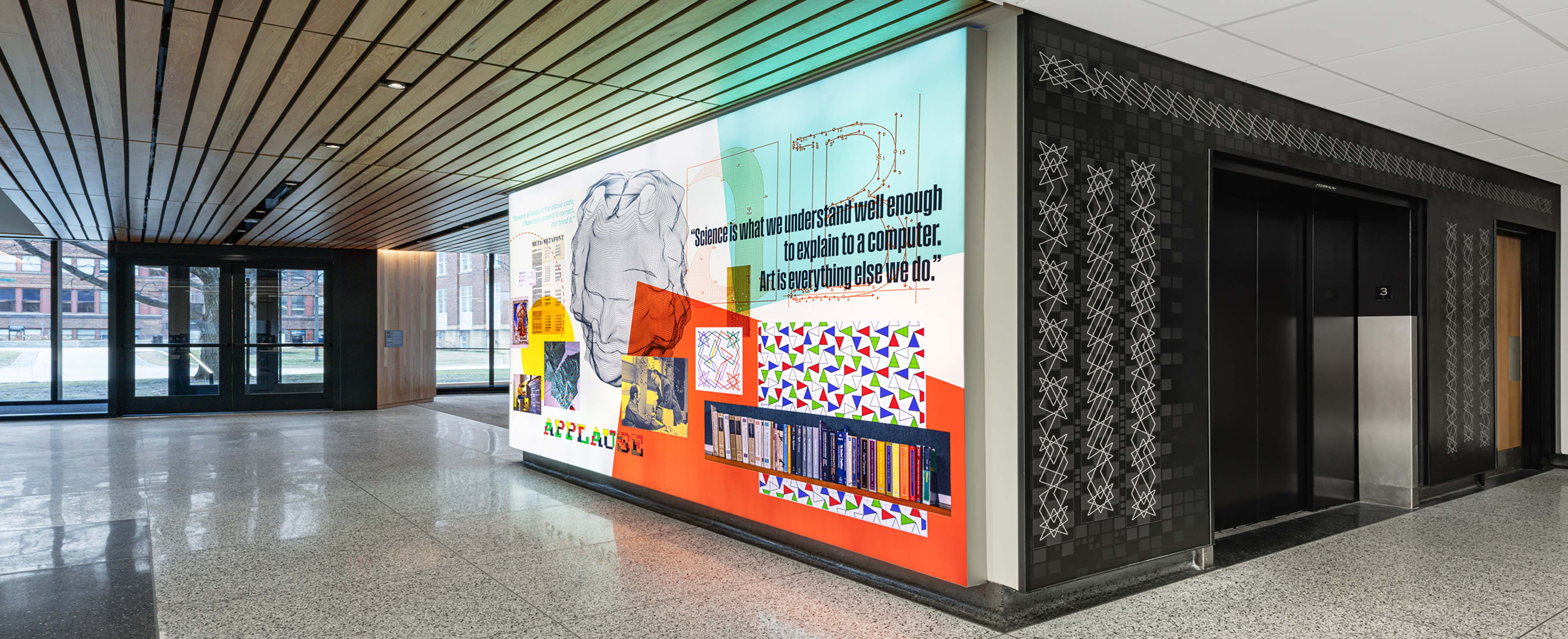 Olin Hall at Case Western Reserve University, home of the Computer and Data Sciences department, has just celebrated the completion of a major renovation project. In the spring of 2024 I was asked for advice about special artwork that might be appropriate to include in the remodeled building. This was a thrilling prospect for me, because I've long been a fan of “Geek Art” — artwork that appeals to both halves of people's brains by being doubly beautiful, having both visual beauty and scientific beauty. (See Chapter 47 in my Selected Papers on Fun and Games.) What better place for Geek Art than the walls of a thriving CS department?