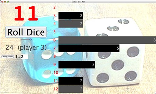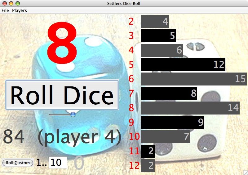 Or you can download this settlers-dice-roll.jar file and save it on your computer. On your computer, just double click settlers-dice-roll.jar file to run it. You need the Java Runtime Environment (JRE) which most machines already have installed (it's free and open source). See JRE download to get java.