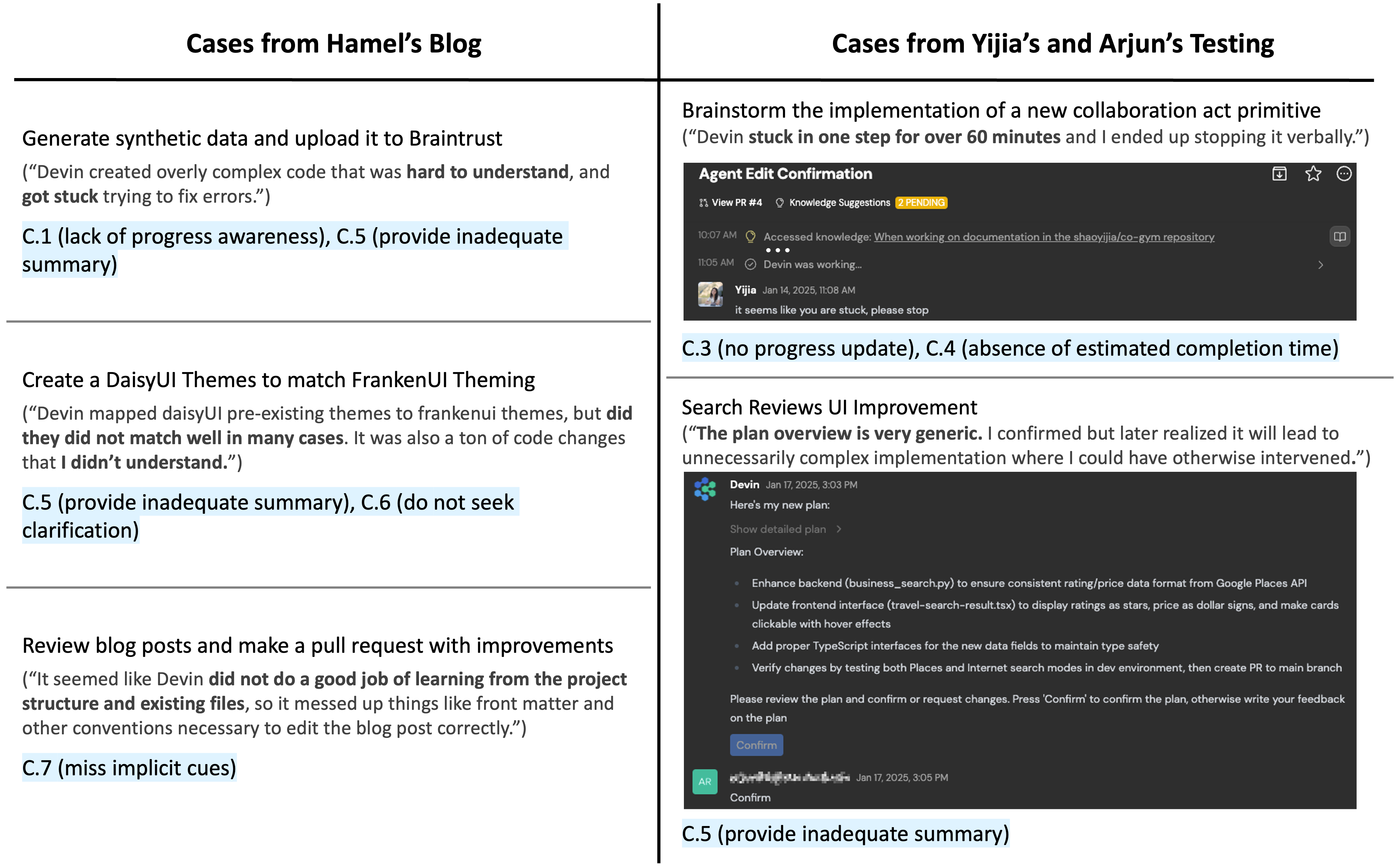 Last week, we shared our recent preprint titled “Collaborative Gym: A Framework for Enabling and Evaluating Human-Agent Collaboration”. Shortly afterward, a blog post titled “Thoughts On A Month With Devin” appeared at the top of my social media feed (smart algorithm :). This post immediately resonated with me—not only because we’ve also tried to use Devin (a coding agent product) to prepare the upcoming release of the Collaborative Gym codebase (WIP, the environment interface is available in this repo), but also because the cases in the blog’s appendix closely align with the findings presented in our paper and my recent thinking.