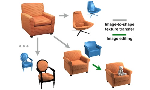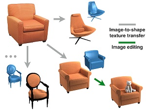 Transfer textures from product images to 3D shapes. The increased texture variation in ShapeNet is validated to be effective for RenderForCNN. The technique can future be used in improving texture of scanning data.