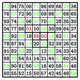 a queen at position 85 attacks all of the prime numbers (shown in green).