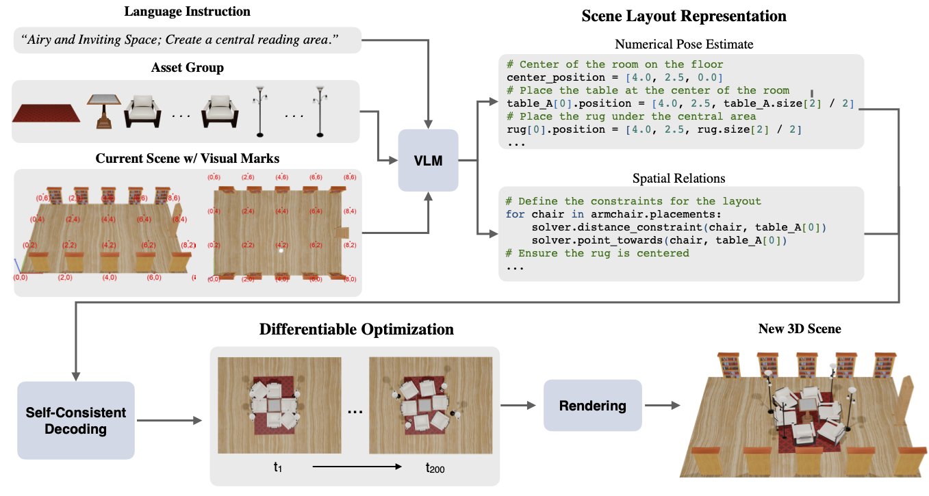 Our approach employs vision-language models (VLMs) to generate code for our proposed scene layout representation that specifies both an initial layout as well as a set of spatial relations between assets (and walls). This representation is then used to produce the final object placements through differentiable optimization.