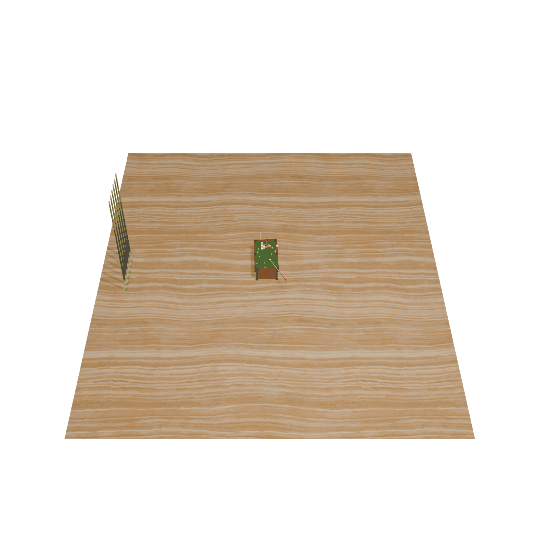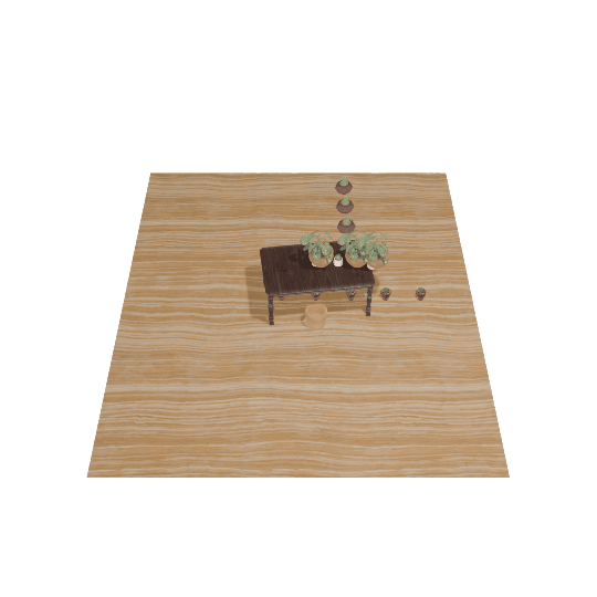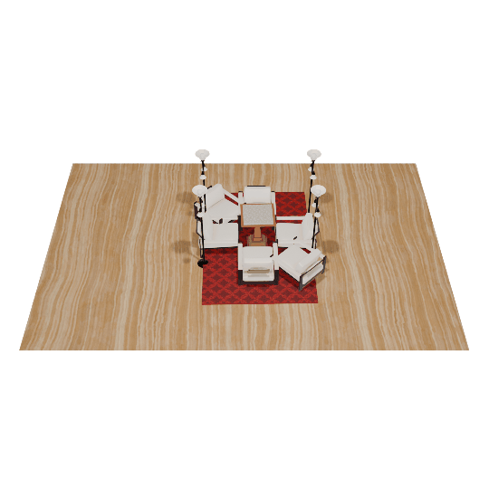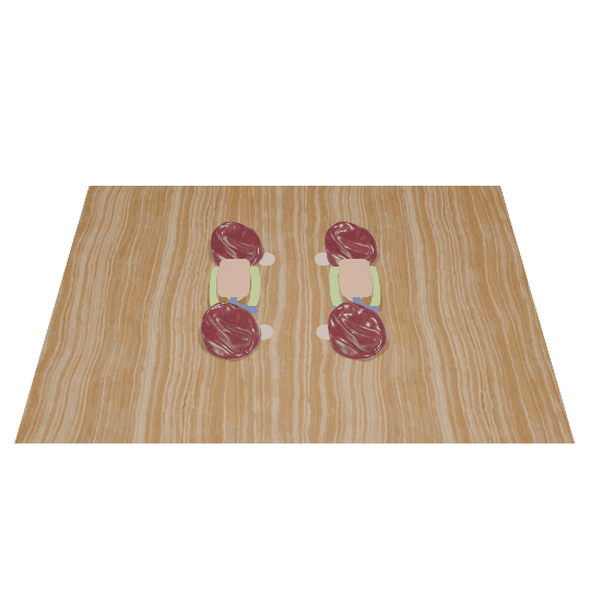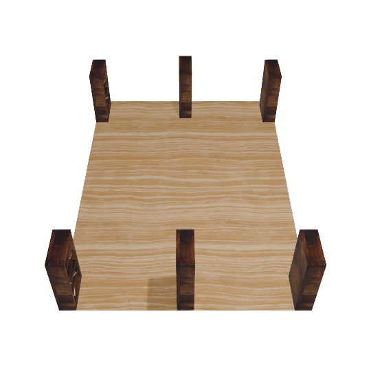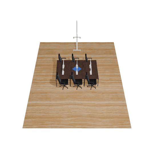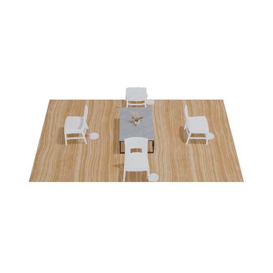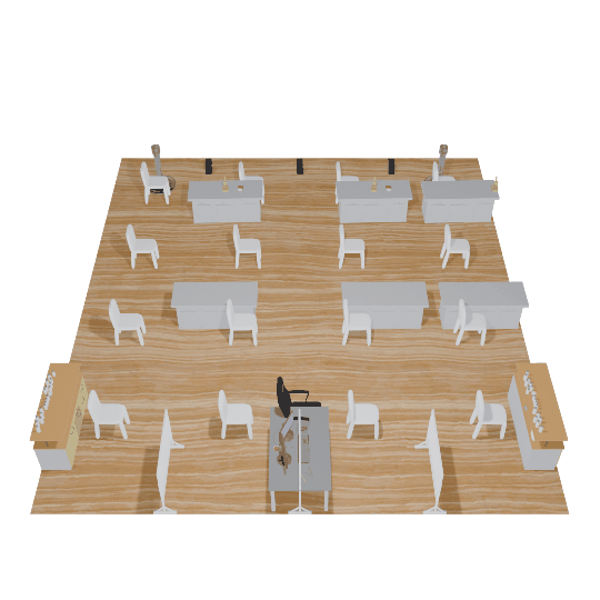 Stack the tables vertically in the middle of the room. Arrange the utensils in a smaller circle around the tables, then position the chairs in a larger circle surrounding the utensils.