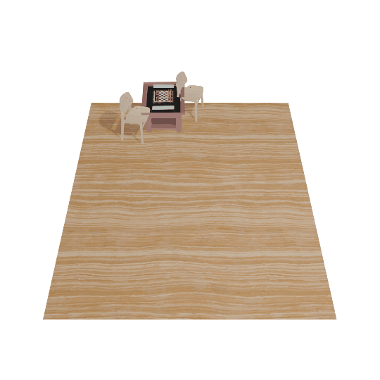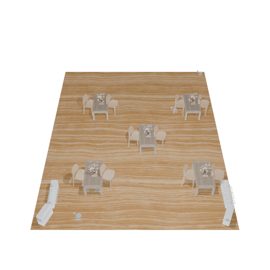 Tables are symmetrically placed in the room; each table should have two chairs on opposite sides of the table facing each other, ready for dining.